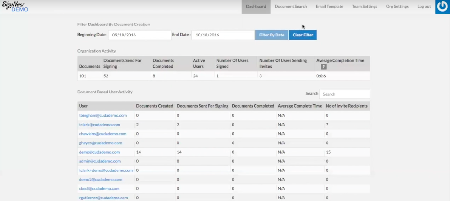 The main screen shows the members of a user’s team and offers specific member reports. The admin with organizational dashboard access can change the team settings and who is added or removed. They can also view how many documents each team member has created, sent, received, and the average amount of time it takes each user to sign a document. This user specific report allows for maximum management in overseeing activity within the team as well as promotes organization of documents past, present, and future.