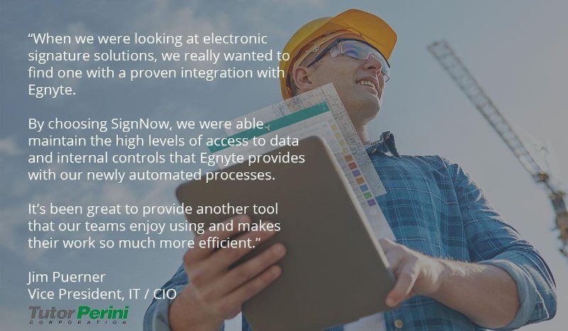 Specifically in regards to construction, one of the biggest clients at signNow is Tutor Perini – one of the largest general contractor firms in the United States. Jim Puerner, the Vice President at Tutor Perini, mentioned that “when [they] were looking at electronic signature solutions, [they] wanted to find one with a proven integration with Egnyte.”